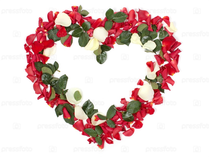 Сердце из красных и белых лепестков роз на белом фоне