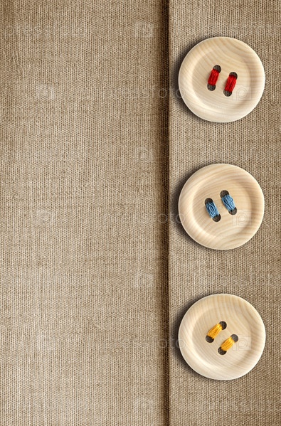 Деревянные пуговицы, пришитые цветными нитками к ткани