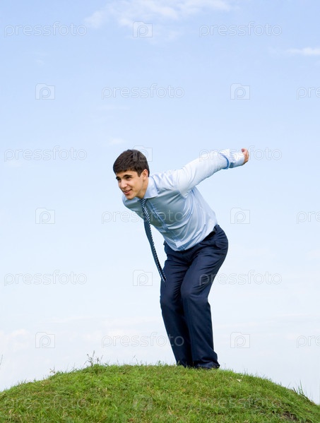 Красивый бизнесмен, стоящий на зеленой траве и собирающийся прыгнуть с голубым небом в фоне