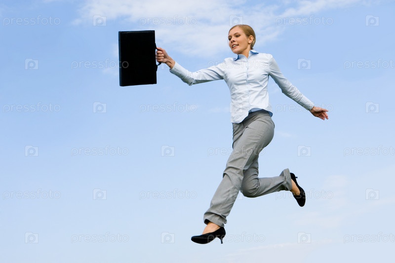 Портрет энергичной женщины с портфелем, прыгающей на открытом воздухе против голубого неба