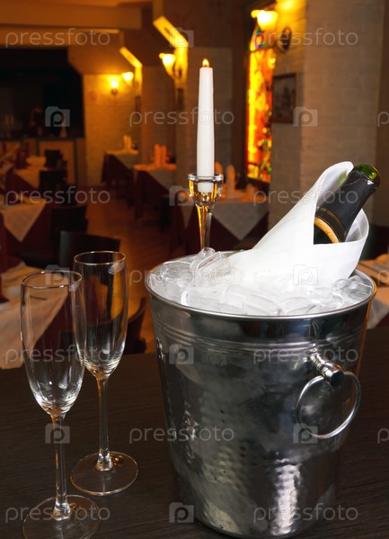 Бокалы шампанского и ведро в ресторане