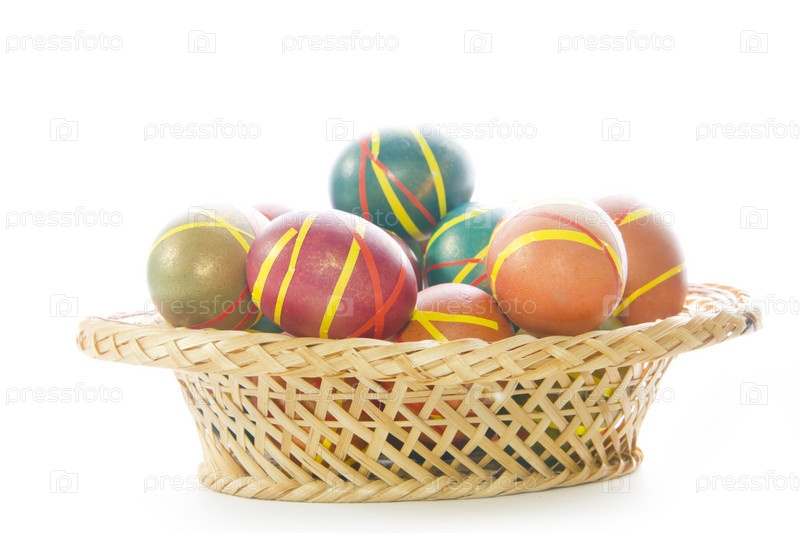 Разноцветные пасхальные яйца в корзинке
