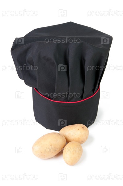 Головной убор шеф-повара и картофель на белом фоне