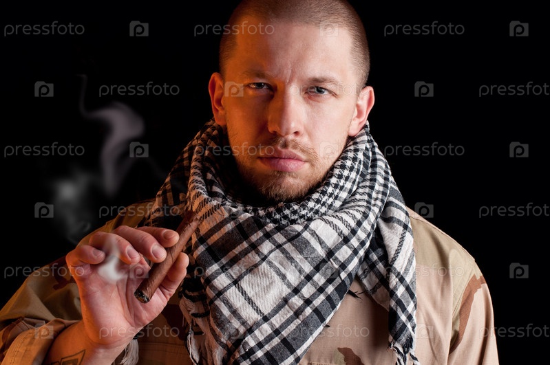 Солдат с сигарой на черном фоне