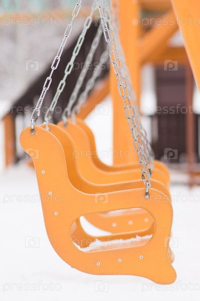Пустые детские качели на зимней детской площадке