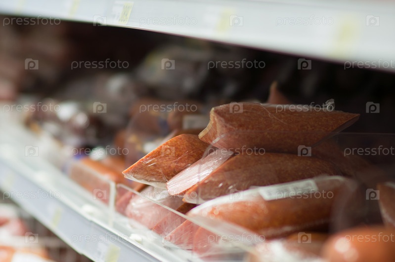 Колбасные деликатесы на полке в супермаркете