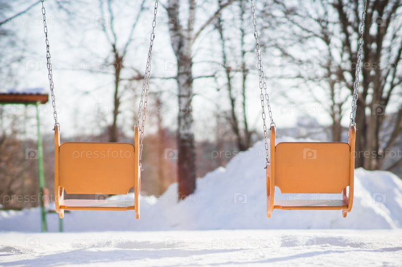 Пустые детские качели на зимней детской площадке