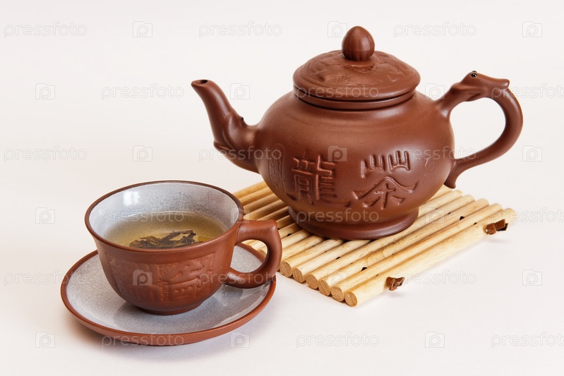 Китайский чайник и чашка с зеленым чаем