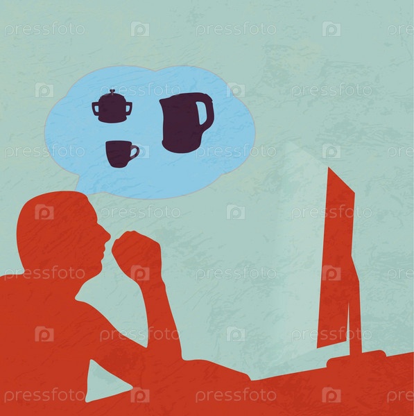 Силуэт мужчины за компьютером, мечтающего о чашке кофе