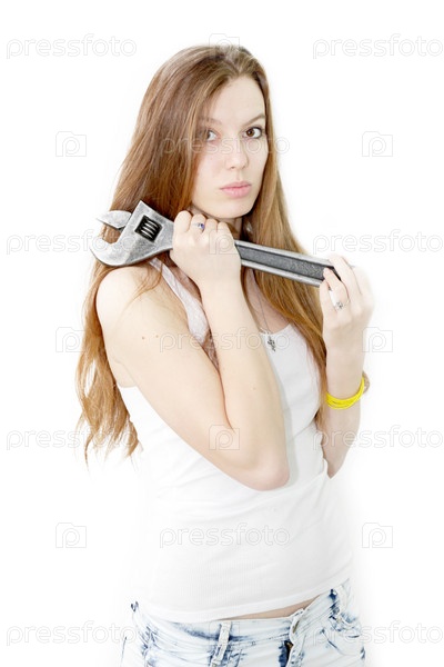 Красивая девушка держит в руках гаечный ключ