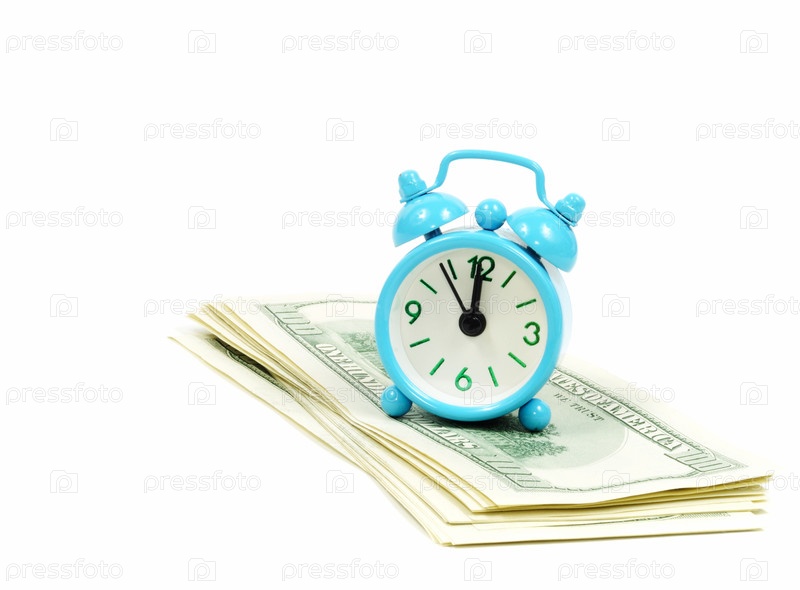 Будильник стоит на пачке долларов на белом фоне