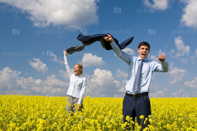 Портрет счастливых деловых партнеров, наслаждающихся жизнью и свободой в желтом поле
