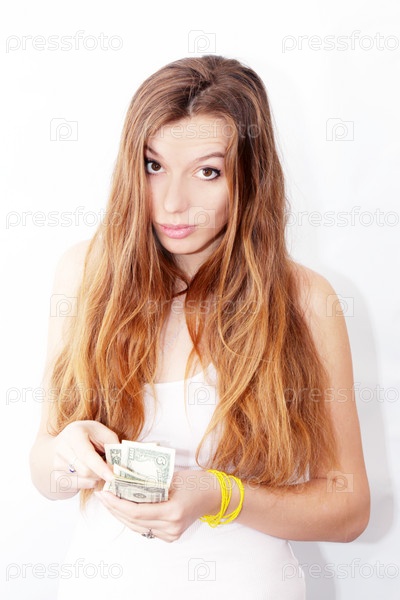 Красивая девушка считает деньги, глядя в камеру