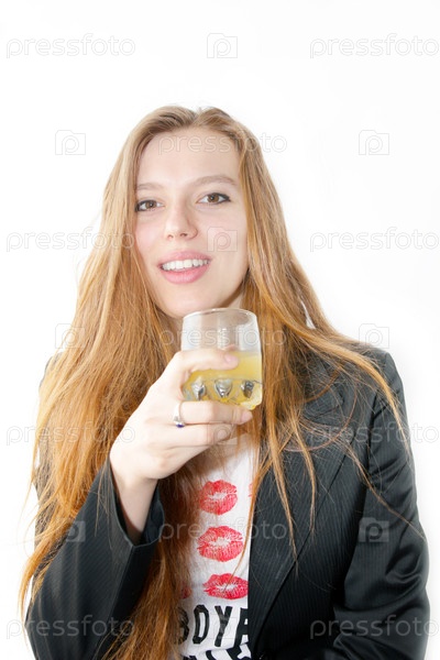 Рыжеволосая девушка со стаканом сока