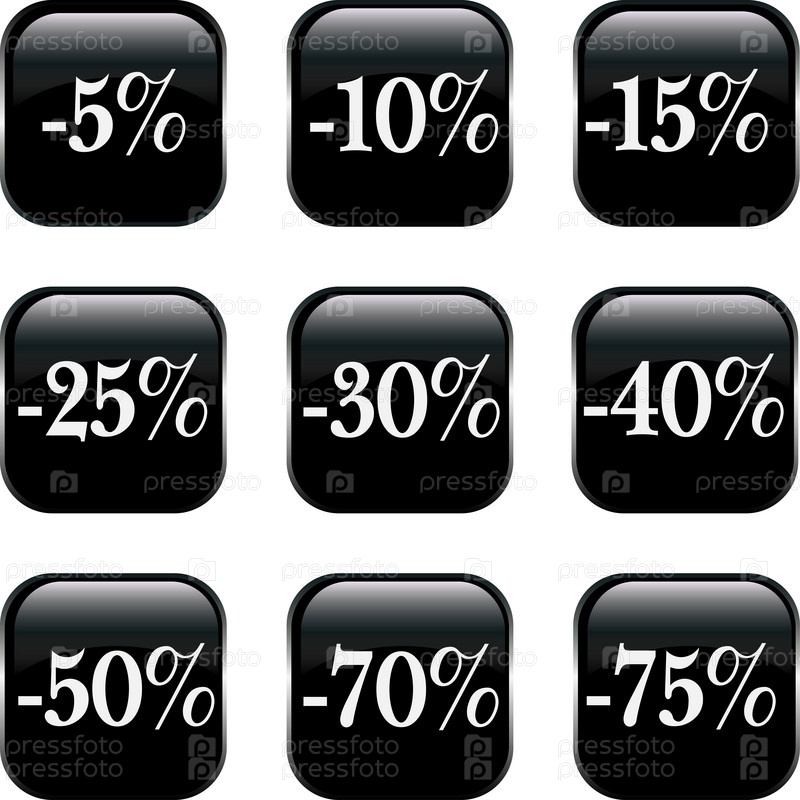 Векторный набор из девяти черных кнопок с процентными скидками