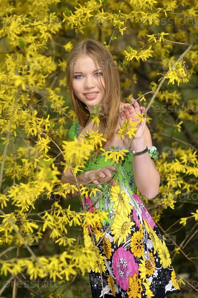 Портрет девушки на фоне форсайтии