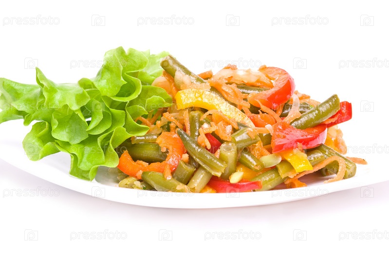 Салат с фасолью и овощами на тарелке, украшенный листьями салата