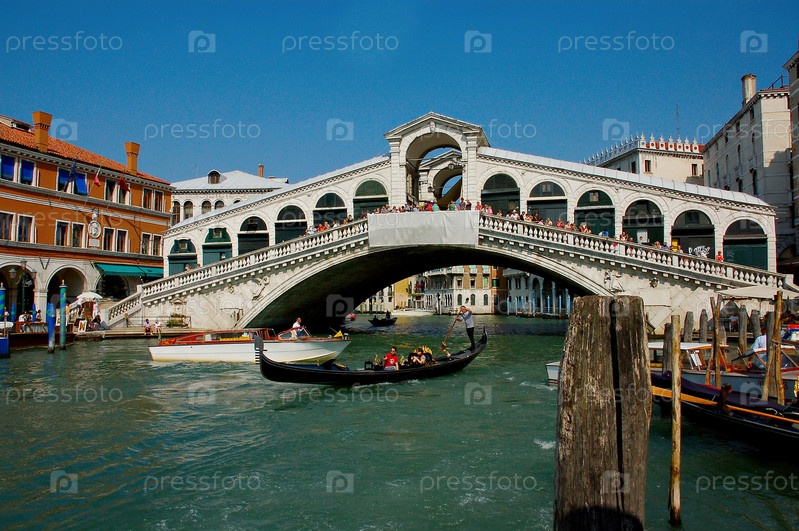 Гранд канал с гондолами и мост Риальто, Венеция, Италия