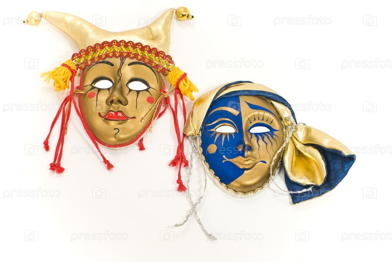 Две карнавальные маски итальянской комедии на белом фоне крупным планом