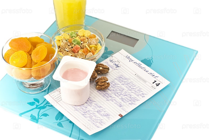 Курага, мюсли, орехи, йогурт, сок и расписанная диета на весах крупным планом