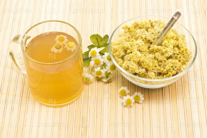 Травяной чай в стеклянном бокале, сухой бессмертник песчаный в стеклянной миске, ромашка и термометр