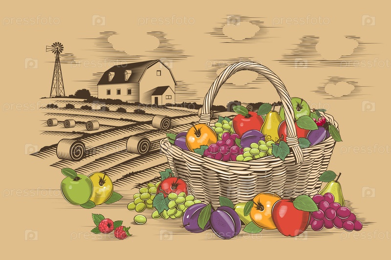 Корзина с фруктами и ферма