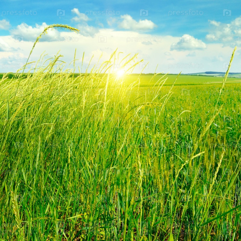 Поле, восход и голубое небо