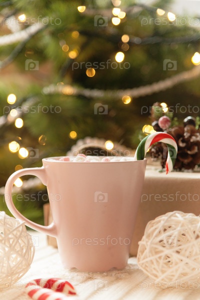 Большая кружка горячего какао и сладкие конфеты