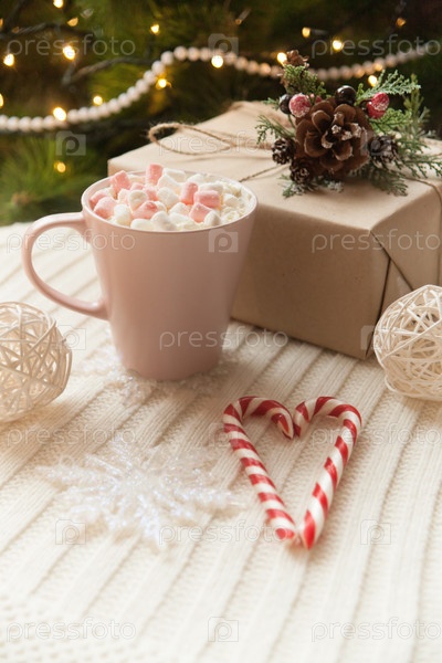 Кружка горячего какао и сладкие конфеты