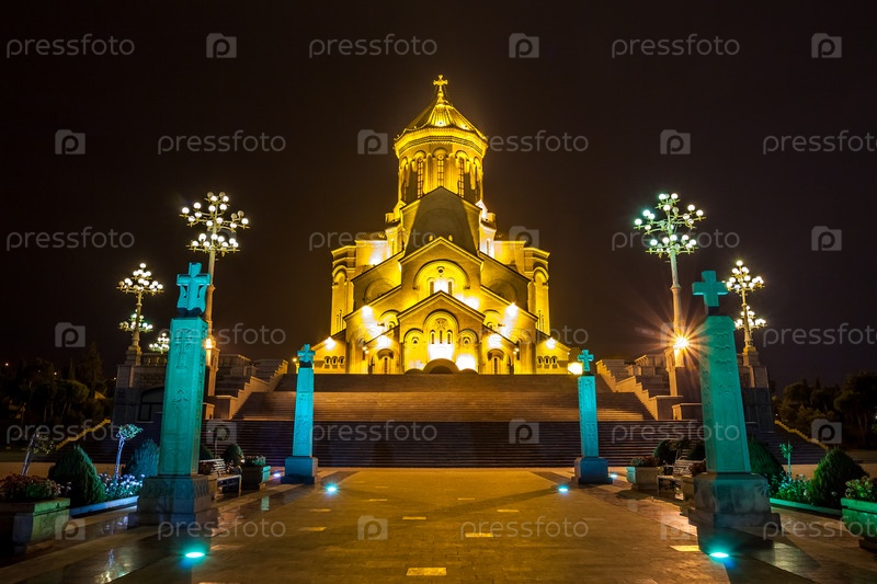Крупнейший православный собор Самеба в Тбилиси ночью, Грузия