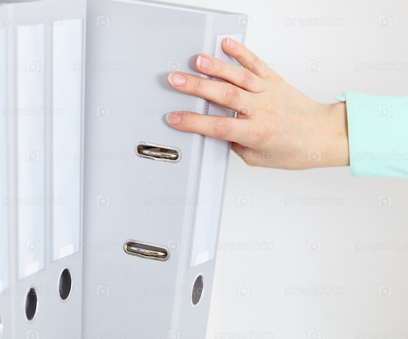 Женская рука тянется за большую папку с документами, которая стоит на полке
