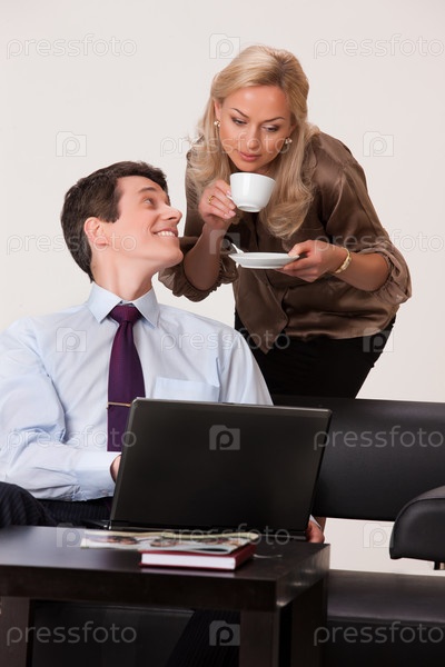 Молодая женщина и мужчина с ноутбуком
