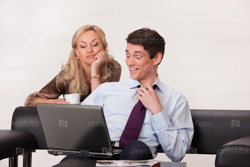 Молодая женщина и мужчина с ноутбуком