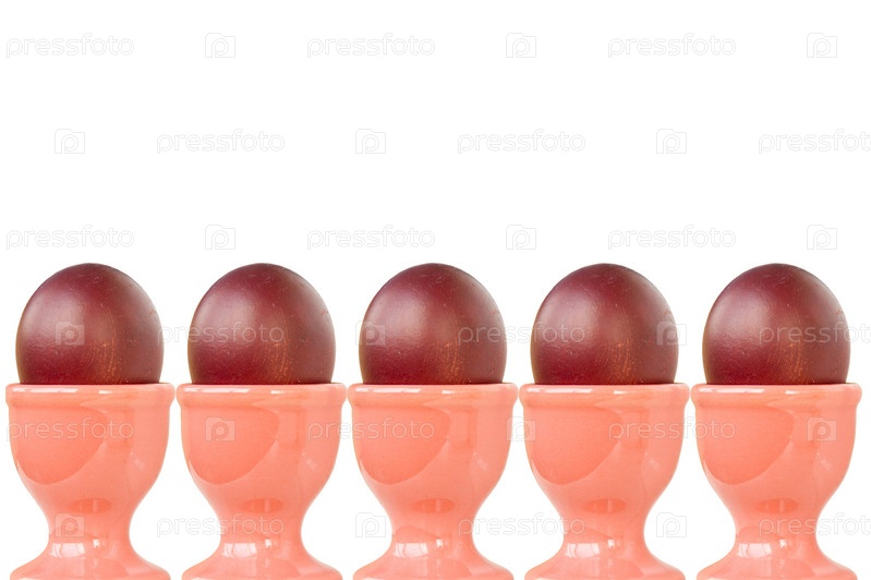 Яйца в керамических подставках на белом фоне