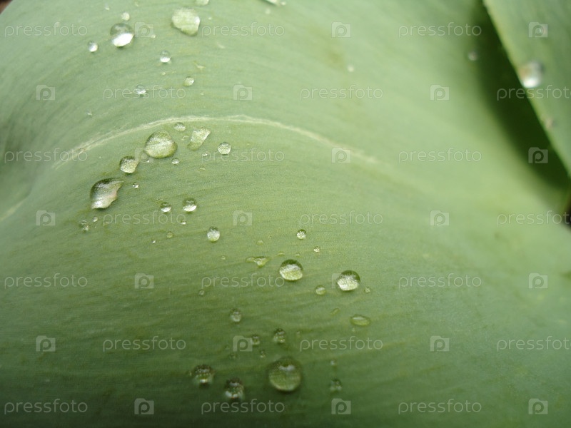 Весенние зеленые листья тюльпана с каплями росы крупным планом