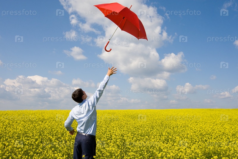 Задний вид молодого бизнесмена, ловящего красный зонтик на цветочном поле