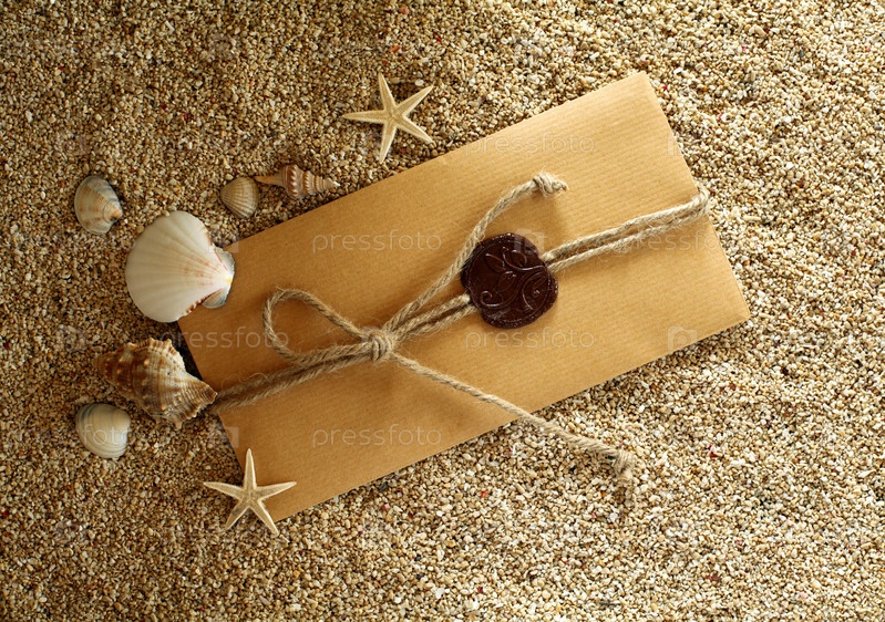Конверт на песке с ракушками