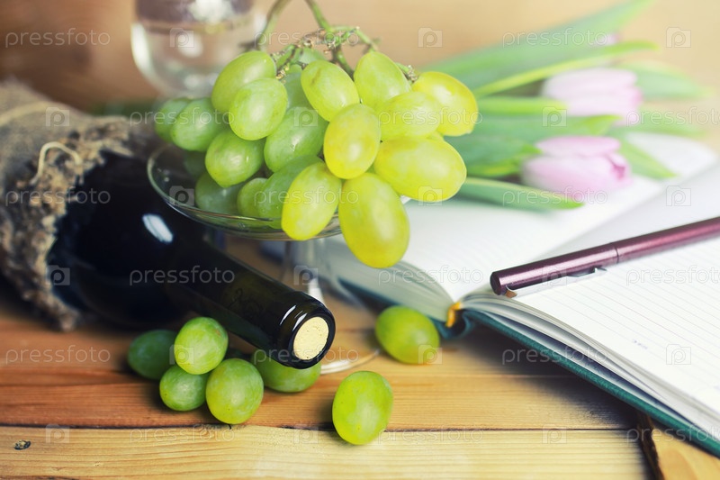 Зеленый виноград и бутылка вина