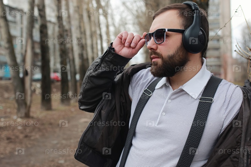 Мужчина слушает музыку в парке
