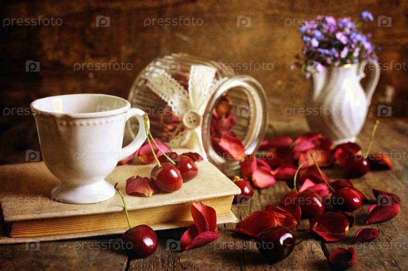 Вишни и лепестки роз