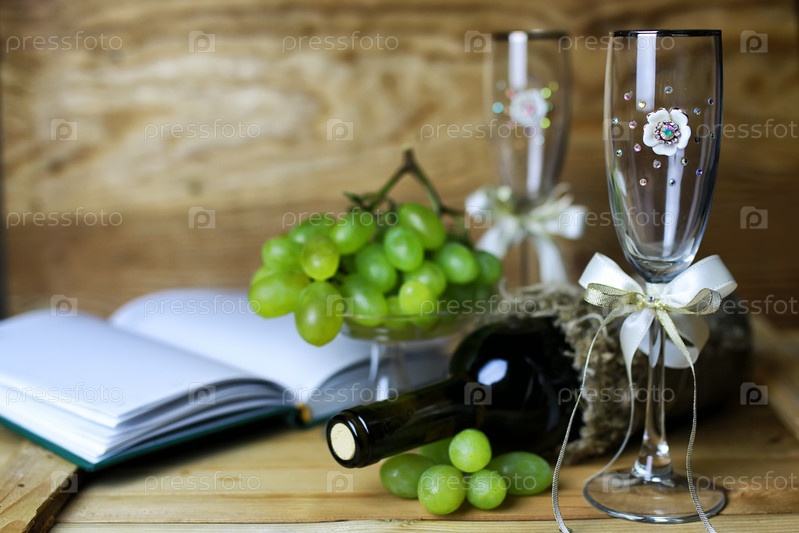 Бутылка вина и зеленый виноград