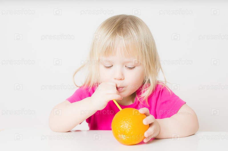 Очаровательная девочка пьет сок из апельсина