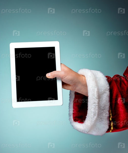 Рука Санта-Клауса держит планшет