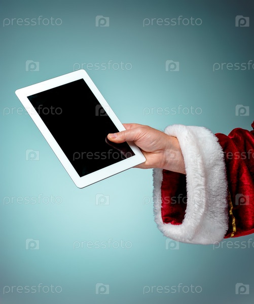 Рука Санта-Клауса держит планшет