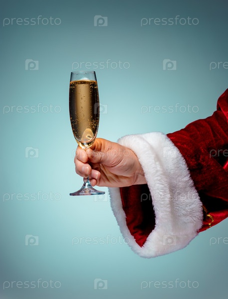 Рука Санта-Клауса держит шампанское