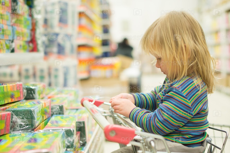 Прелестный ребенок, сидящий в тележке в супермаркете
