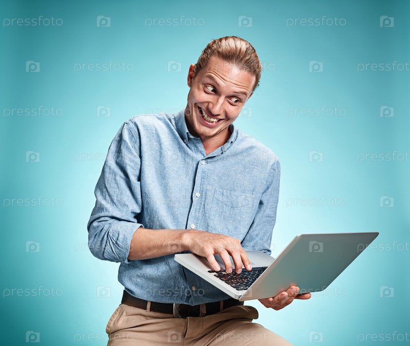 Эмоциональный мужчина с ноутбуком