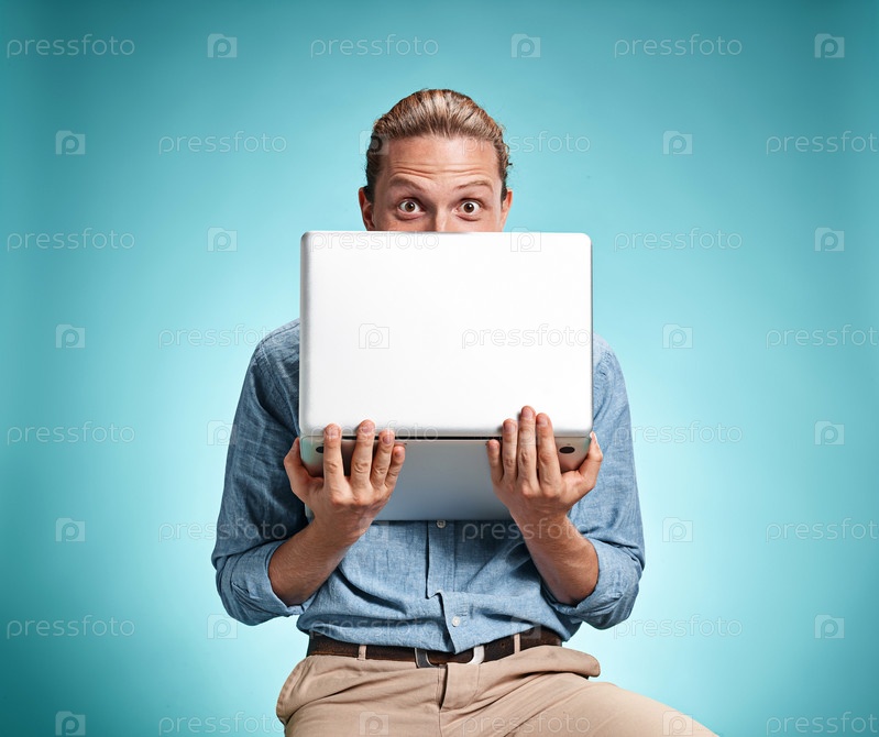 Эмоциональный мужчина с ноутбуком