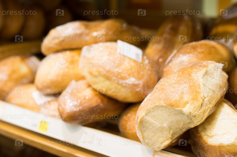 Булки хлеба на полке в супермаркете