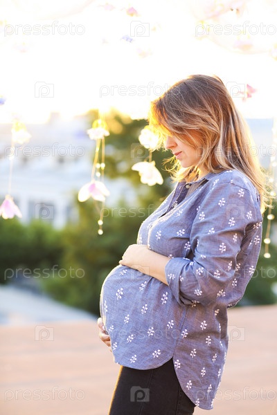 Беременная женщина на фоне города